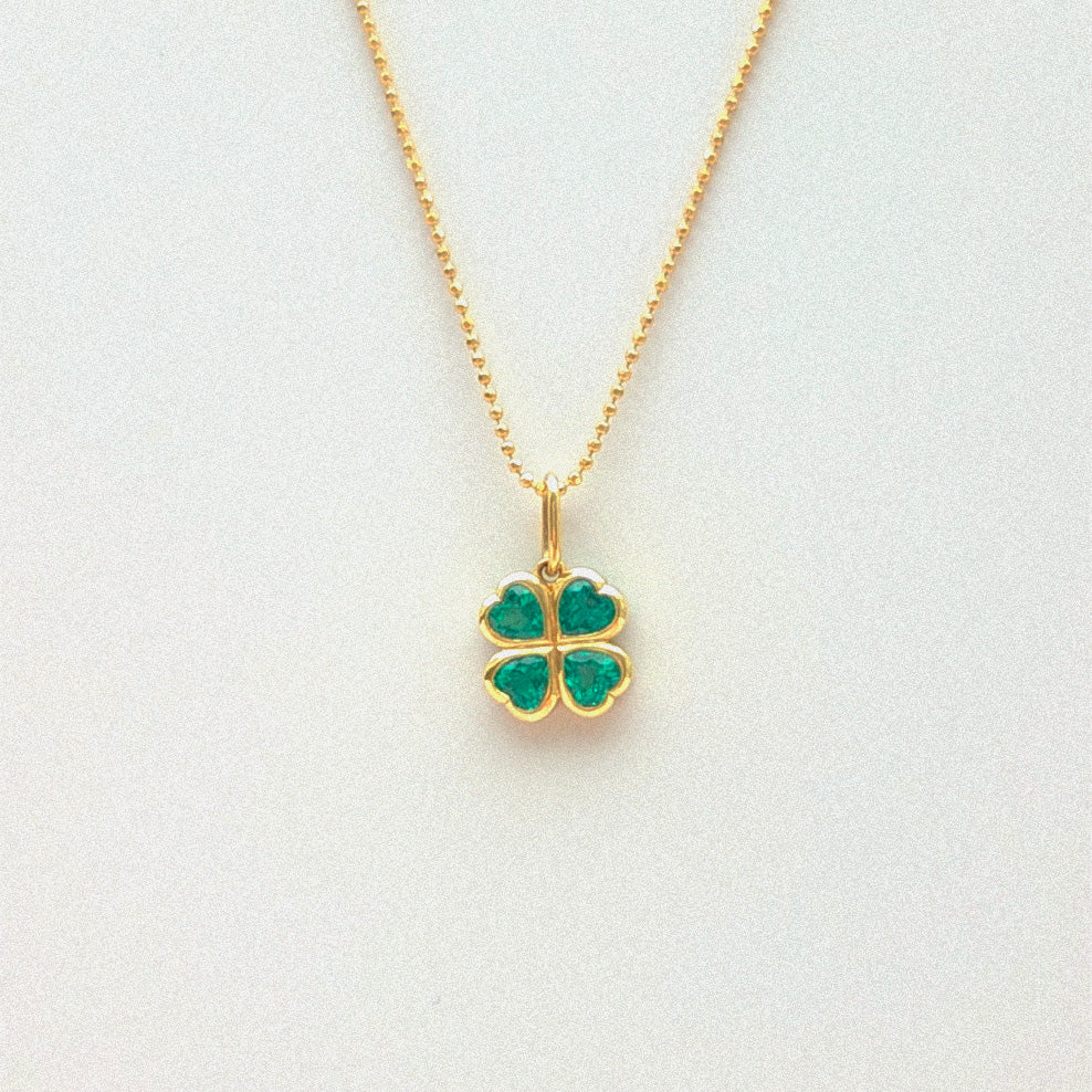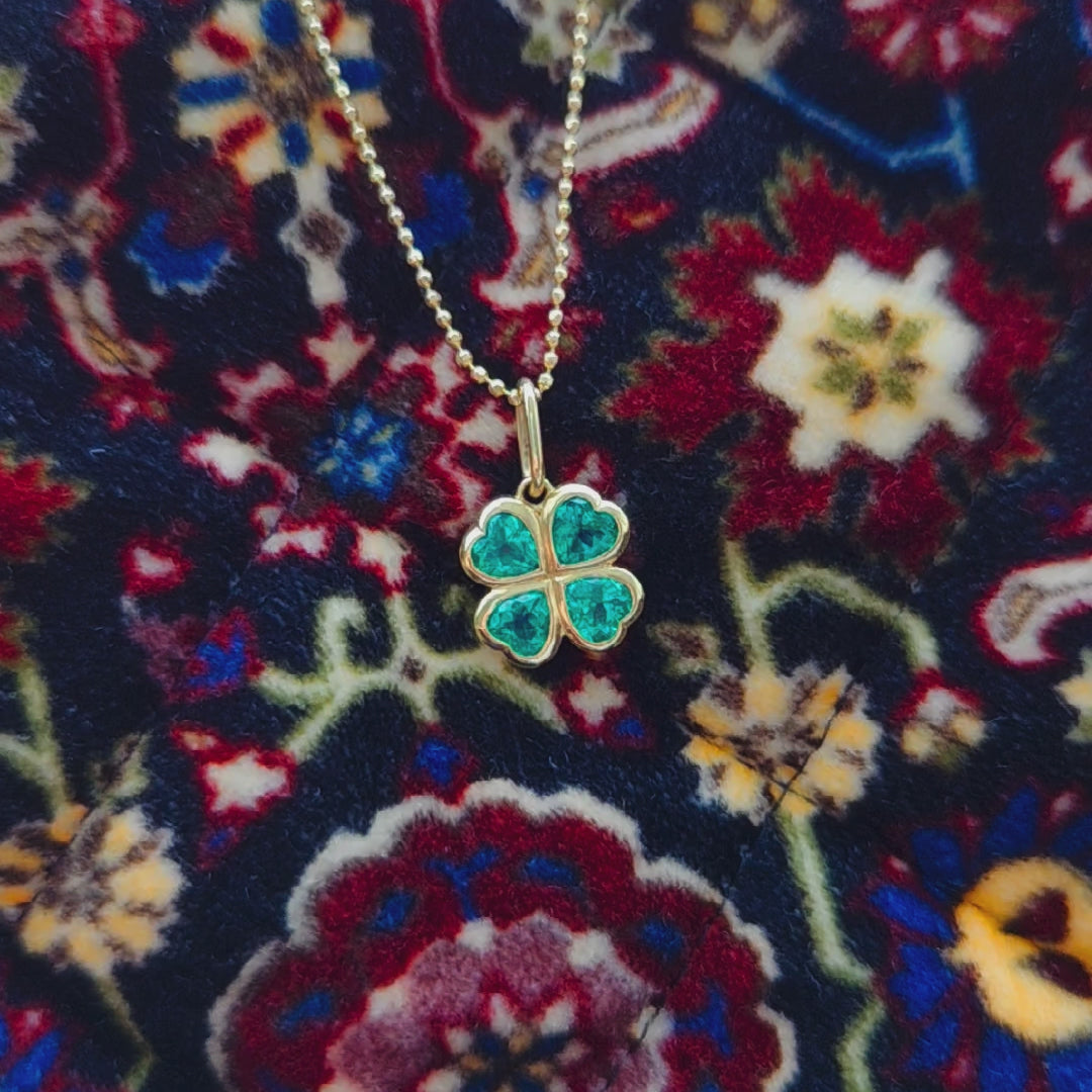 A Four Leaf Clover crafted out of 4 hand cut and perfectly matching heart shaped emeralds on our signature handcrafted bezel setting.